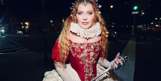 На самый страшный праздник года певица выбрала роскошный образ Червовой королевы из фильма "Алиса в стране чудес". Она надела красное платье с белым жабо и крестом на голове. Рыжие длинные волосы Мадонны были накручены локонами.