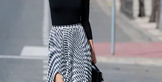 Дизайнерский ход привлекал внимание к наряду королевы, которая дополнила юбку простым черным свитером, туфельками из крокодиловой кожи на шпильке от Magrit и черной сумочкой от Giorgio Armani.