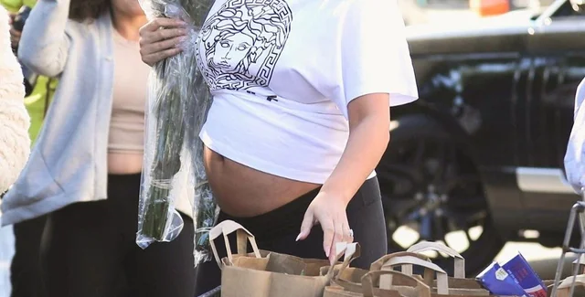 Будущая мать была одета в короткую белую футболку от Versace, которая немного оголяла ее большой живот и черные лосины, а на ногах были кожаные шлепанцы.