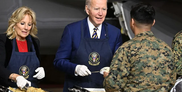Президент США Джо Байден и его супруга Джилл Байден на днях посетили авиабазу морской пехоты Черри-Пойнт в Гейвлоке, штат Северная Каролина, где приняли участие в праздновании Дня благодарения вместе с военными и их семьями. Об этом пишет NPR.
