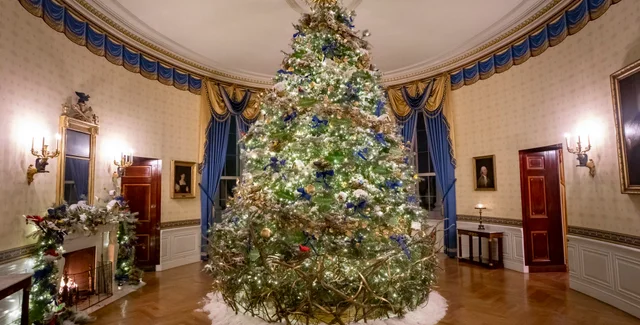 Для украшения Белого дома были привезены 77 елок и 25 венков, все праздничные декорации украшают 83 615 праздничных огней.
