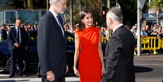 Для выхода в свет Летиция выбрала облегающее ярко-оранжевое платье без рукавов из коллаборации Zara x Narciso Rodriguez, а в руках несла черную сумку от Giorgio Armani. Аутфит королевы завершили замшевые туфли с острым носком от Prada.