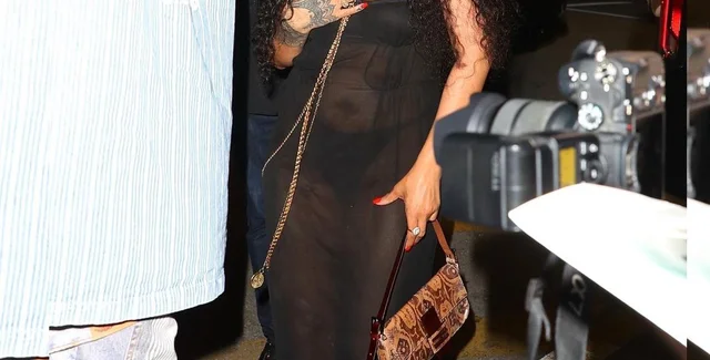 Тогда Рианна была одета в мерцающий костюм со стразами от бренда Khaite Argo из весенней коллекции 2023 года, который дополнила гламурной сумкой от этого же бренда. Она завершила образ серебряными босоножками, бриллиантовым колье и большими черными солнцезащитными очками.