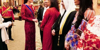 На нем Кейт Миддлтон появилась в роскошном платье от своего любимого бренда Jenny Packham: красном, закрытом и украшенном вышивкой.