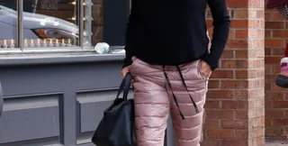 Голди прогуливалась в дутых нежно-розовых штанах, уггах молочного цвета с вязаными деталями, а также в черной кофте в рубчик.