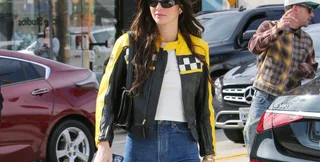 Девушка была одета довольно просто, ведь выбрала классические широкие синие джинсы от бренда Khaite Danielle, которые сочетала с белой футболкой и байкерской курткой с черно-белой клетчатой отделкой на груди и желтыми полосками на рукавах.