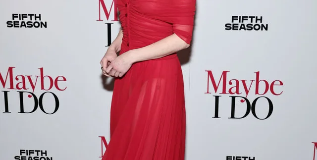 Для выхода в свет девушка выбрала красное миди-платье с V-образным декольте и пуговицами спереди из коллекции Philosophy di Lorenzo Serafini весна-лето 2023.