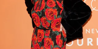 Свой аутфит мама миллиардера дополнила черной шубой из искусственного меха, красными плотными колготами и черными босоножками в ретро-стиле с квадратными носками, каблуками и ремешками на лодыжке.