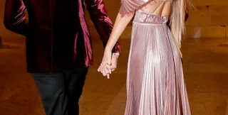 Волосы Жизель были зачесаны назад, а образ завершал сияющий макияж, включая хайлайтер и розовую помаду.