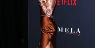 Благодаря открытому платью на бретельках она продемонстрировала все свои татуировки.