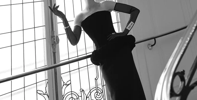 Этот элегантный полностью черный ансамбль состоит из топа-бюстье Schiaparelli и юбки миди, дополненных украшениями Dolce & Gabbana и винтажной шляпой Cartier, копируя образ Хепберн из классического фильма "Завтрак у Тиффани" 1961 года.