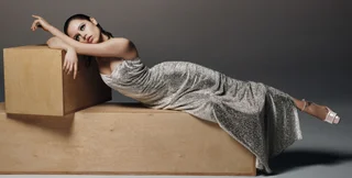 Составить конкуренцию топу в виде огромного листа может серебряное платье JW Anderson без бретелек. Платье выглядело как одна гигантская серебряная бусина. На актрисе ничего не было под ней, а ее руки были украшены серебряными манжетами Elsa Peretti и Tiffany & Co., Оригинальный наряд она дополнила парой бирюзовых туфель на каблуке Roger Vivier.
