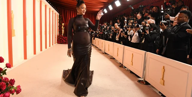 И она не разочаровала. Рианна возглавила список самых стильно одетых селебрити на Оскаре, продемонстрировав свой беременный живот в прозрачном коричневом кожаном платье Alaia с вырезами вдоль бедер.