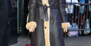 Наряд звезды также отличался кремовой отделкой из овечьей шерсти и кожаным ремешком. Свой образ она дополнила бордовыми туфлями на каблуке. К наряду Перри подобрала маленькую бордовую сумку, массивные серьги, а черные волосы уложила в высокую прическу.
