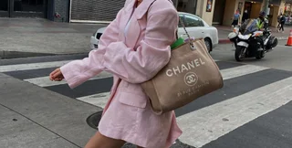 К модному фасону девушка подобрала коричневую прозрачную водолазку в рубчик и кожаную куртку цвета хаки. Основательница Helsa дополнила образ парой сандалей Sam Edelman, сумочкой Louis Vuitton и солнцезащитными очками.