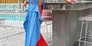 Бывшая участница группы "Spice Girl" позировала у бассейна в платье из ее собственной коллекции, которое отличалось пикантным глубоким синим вырезом спереди, переходящим в длинную красную юбку.