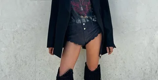 Шейк надела черные короткие кожаные шортики, малиновый бомбер поверх черно-белой футболки с изображением Тупака Шакура и кожаные сапоги до колен. Образ завершали крупные серьги-кольца и солнцезащитные очки.