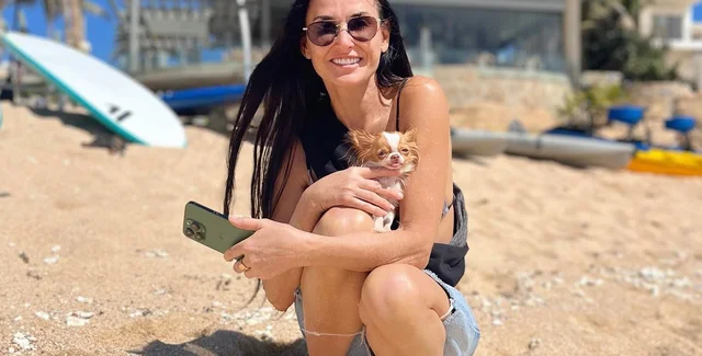 На первом фото Деми позирует, лежа на диванчике с подушками. На ней – бикини с леопардовым принтом, а на груди сидит ее пес. На втором снимке актриса уже в джинсовых шортах и футболке на пляже, держит животное в специальном слинге для него. Глаза звезды спрятаны за стильными солнцезащитными очками, а волосы распущены и развеваются на ветру.