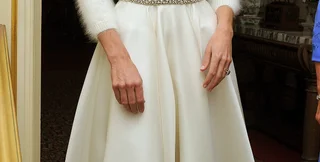 Есть всего несколько фото Кейт Миддлтон в этом платье. Оно было изготовлено из белого атласа с вышитым стразами поясом. В него Кейт переоделась в Кларенс-хаусе, чтобы отправиться на свадебную вечеринку в Букингемский дворец.