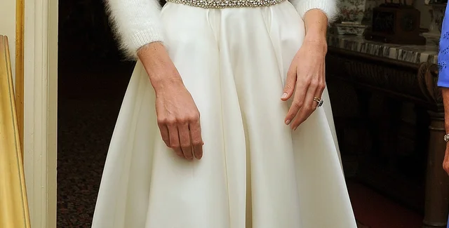 Платье цвета слоновой кости с атласным лифом и кружевными рукавами, как считается, было вдохновлено свадебным платьем Грейс Келли.
