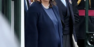 32-летняя беременная принцесса Евгения надела роскошное темно-синее свободное платье от бренда Asceno стоимостью 575 фунтов стерлингов, черный кардиган и дополнила образ туфлями оригинального фасона. На голове у нее была небольшая шляпка, а шею украшало роскошное бриллиантовое колье-чокер Albemarle из белого золота с бриллиантами стоимостью 130 000 фунтов стерлингов и серьги-подвески из белого золота с бриллиантами стоимостью 26 000 фунтов стерлингов от Garrard.