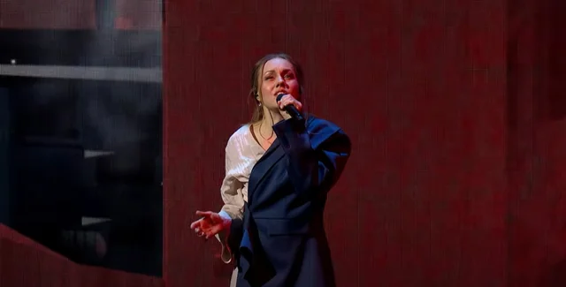 Затем в зале раздается воздушная тревога, и на сцене появляется Alyosha. За ее спиной – кадры прощания женщины с любимым, который уходит на войну. Она сначала поет на украинском языке, а затем переходит на английский.