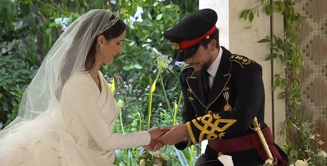 К алтарю ее вел младший брат жениха, принц Хашем ибн Абдалла. А принц Хусейн не мог сдержать эмоций, когда увидел ее в первый раз в свадебном платье. Свой образ Раджва дополнила изящной бриллиантовой тиарой.