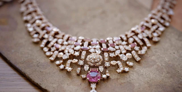 Главное украшение коллекции — колье Tweed Royal, пластрон из желтого золота с бриллиантами и 37 рубинами, отличающееся замысловатым переплетением, которое помогает ему плотно прилегать к коже, как "тканевая броня", задуманная Габриэль Шанель.