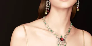 Более насыщенные оттенки отражают тепло лета через изумруды, шпинели и турмалины параиба, усыпанные многогранными бриллиантами. Изысканные конструкции, смелые фасоны, такие как веер, указывают на мастерство Gucci.