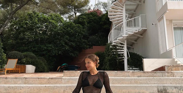 На Николь – длинное черное платье-сетка с длинными рукавами, высоким разрезом на бедре и открытой спиной, которое она накинула на черное бикини.