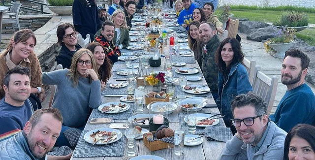 Так, за столом радостно улыбающихся в камеру гостей можно разглядеть Дженнифер Энистон. А также ее коллегу по сериалу "Друзья" – Кортни Кокс с ее женихом Джонни МакДейдом из Snow Patrol.