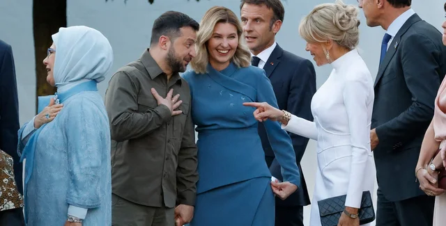 На ужин чета Зеленских прибыла вместе с четой Макрон. И 45-летнюю Елену и 70-летнюю Брижит уже назвали самыми стильно одетыми первыми леди саммита НАТО.