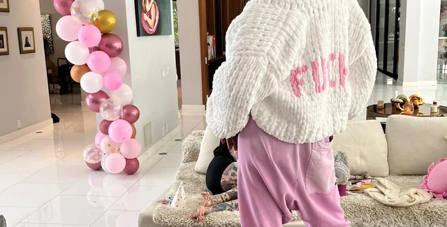Для празднования дня рождения знаменитость выбрала розовый трикотажный комплект от Area, состоящий из кардигана с ромбами за 1180 фунтов стерлингов с застежкой-бантом со стразами и шорт стоимостью 549 фунтов. Образ завершали розовая кожаная портупея, надетая под кардиган, высокие черные ботинки на массивной платформе, большие серьги и черный бант.