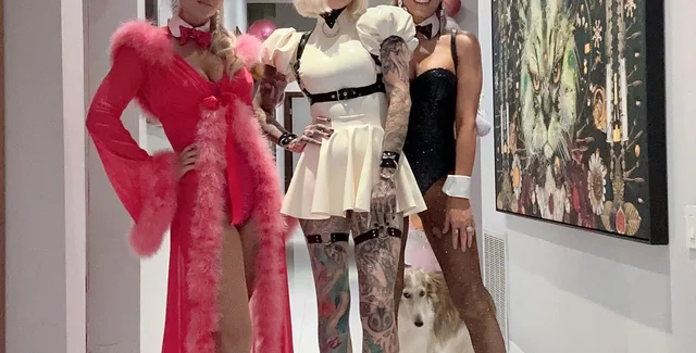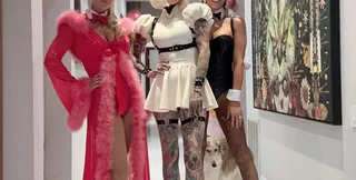 Рядом с Бекинсейл – две ее подруги. Одна – в образе розового кролика, а вторая в белом парике, белом платье с портупеями, высоких сапогах-стрипах черного цвета, а ее руки и ноги полностью разрисоваы татуировками.