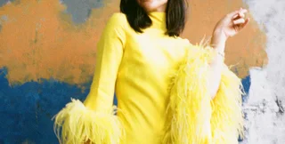 Галь Гадот позировала на новых снимках в модном ярко-желтом платье с перьями
