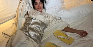 Основательница SKIMS собрала свои темные волосы в пучок канзаши, который часто принимают за палочки для еды и примерила серебристо-белое кимоно, позируя в лифте и гостиничном номере.