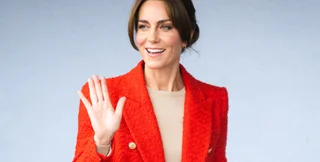 41-летняя принцесса Уэльская надела тот же красный твидовый пиджак с золотыми пуговицами, в котором она дебютировала во время визита в Копенгаген, Дания, в 2022 году, заменив белую блузку с рюшами, с которой она изначально носила пиджак, на простую бежевую футболку.