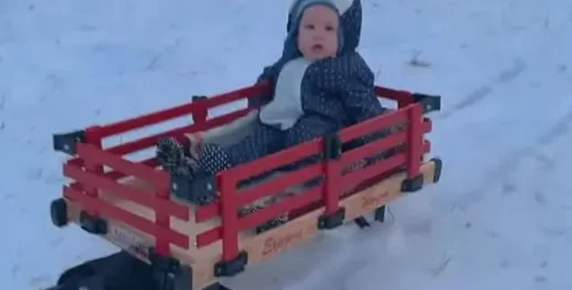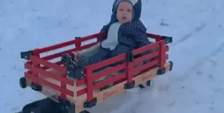 На домашних видео Арчи, тепло одетый в зимний комбинезон Mini Boden Panda, смотрит на заснеженную местность, сидя в красных деревянных санях.