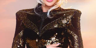На снимках Шер позирует в расшитом пайетками комбинезоне Versace и высоких сапогах в тон от Bottega Veneta. Визажист приклеил ей под глаза стразы, а на голове у артистки – белый парик, собранный в прическу.