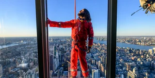 Артист взбирается по стене небоскреба в красном комбинезоне. Он стал первым человеком, который когда-либо легально поднялся на Эмпайр-стейт-билдинг.