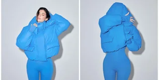На своей странице в Instagram Дженнер опубликовала фото, на которых позирует в голубом пуховике до бедра.