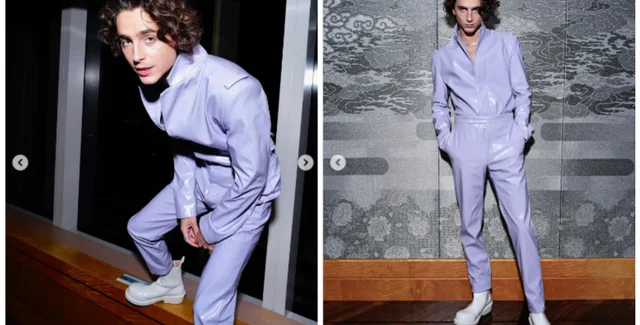 Тимоти Шаламе надел кожаный костюм в ярко-лавандовом цвете от итальянского бренда Prada, дополнил он свой образ украшениями от французского ювелирного бренда Cartier. Завершили образ актера массивные белые сапоги.