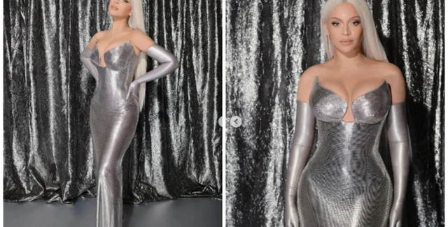 Относительно одежды, которую выбрала певица. Она надела серебристое платье в пол из коллекции Versace, которое имеет откровенное V-образное декольте. Дополнила платье певица высокими латексными перчатками в тон и босоножками идентичного цвета.