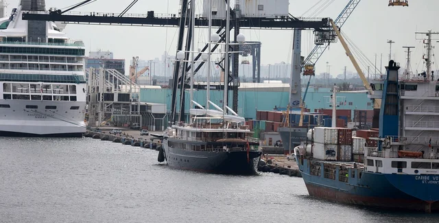 На эксклюзивных фото, полученных СМИ, видно, что трехмачтовая "Кору", пришвартованная в порту Эверглейдс, приютилась между гигантскими нефтяными танкерами и огромным круизным лайнером Liberty of the Seas.