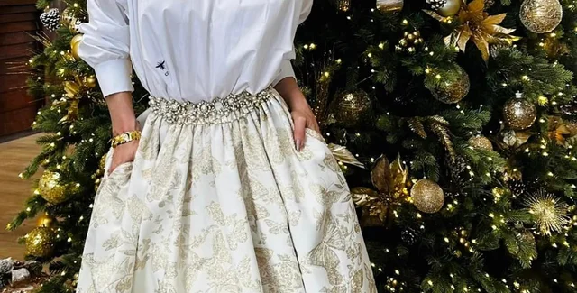 Более того, даже одежду для фото артистка выбрала в тон: на ней была белая блуза, длинная парчовая юбка теплых оттенков и серебристые босоножки на каблуке с массивной платформой, украшенные маленькими пчелками. Ее волосы традиционно гладко зачесаны и собраны в пучок, а в ушах – серьги из белого золота.