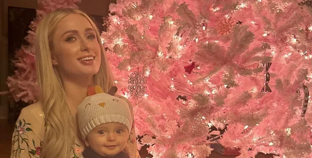Малыш, которому вскоре исполнится один год, позировал на лестнице возле Пэрис и их домашнего любимца. Знаменитость предстала в розовом платье и блестящих туфлях накануне Рождества 2023 года.