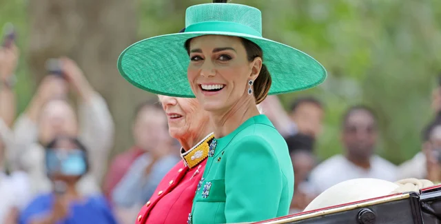 Кейт сияла под летним солнцем во время парада в своей зеленой шляпе от известного дизайнера Филиппа Трейси, которой она дополнила свой наряд от Andrew Gn с красивыми пуговицами.