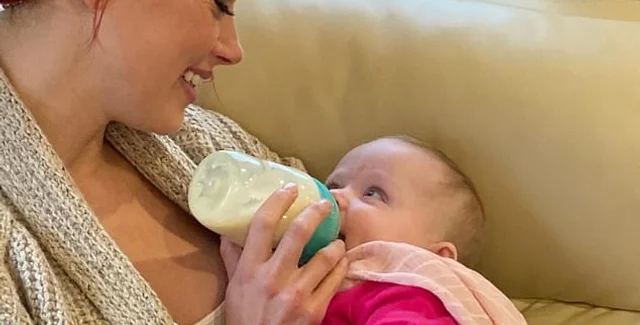 На втором фото она сияла, когда ее маленькая дочь отражала ее улыбку, когда мама кормила ее из бутылочки.