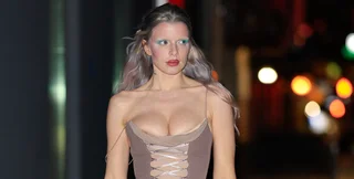 Джулия Фокс отправилась на костюмированный бал в рамках Недели моды в Нью-Йорке в эффектном коричнево-бежевом платье Eunoia, подчеркивающем ее бюст и талию. На сайте бренда это платье называют "шекспировским" и оно стоит 2836 долларов.
