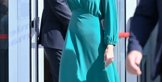 Под дизайнерским пальто скрывалось великолепное персидское зеленое платье от Dandara Spain. У платья был высокий вырез-капля и рюши на талии, подчеркивающие ее силуэт. Платье также имело эластичные рукава с манжетами, придающие изделию форму, и струящуюся юбку длины миди.